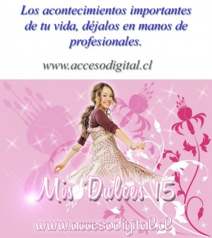Para tu fiesta de los 15 años, Jorge Garrido fotógrafo profesional te ofrece un servicio de primer nivel que incluye lo siguiente: .- Cobertura fotográfica sin límite de imágenes ni horarios. .- Entrega de todas las fotografías en dos DVD`S con estuche y fotografía de la festejada en su portada incluye las imágenes originales y editadas.. .- Álbum Digital alojado en nuestro sitio web con clave secreta que solo la festejada tendrá. .- Una ampliación a gusto de la festejada tamaño 20cm x 30cm Importante: El servicio es personalizado, y se adaptará a los requerimientos y necesidades de cada evento en particular. El cliente podrá solicitar una reunión sin compromiso para ver muestras, despejar dudas e inquietudes y exponer sus prioridades. Muestra galería On Line: www.accesodigital.cl/constanza Consultas y Cotizaciones: accesodigital@gmail.com Jorge Garrido Cel: 97795315 www.accesodigital.cl